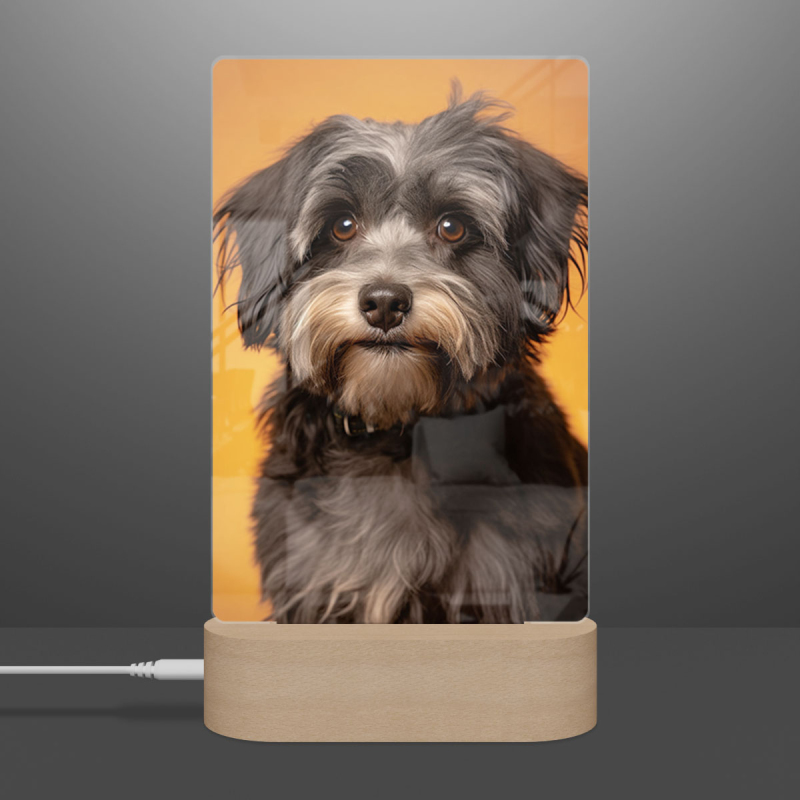 Součástí balení je akrylové sklo dle výběru, dřevěný RGB LED stojánek a napájecí USB kabel.
