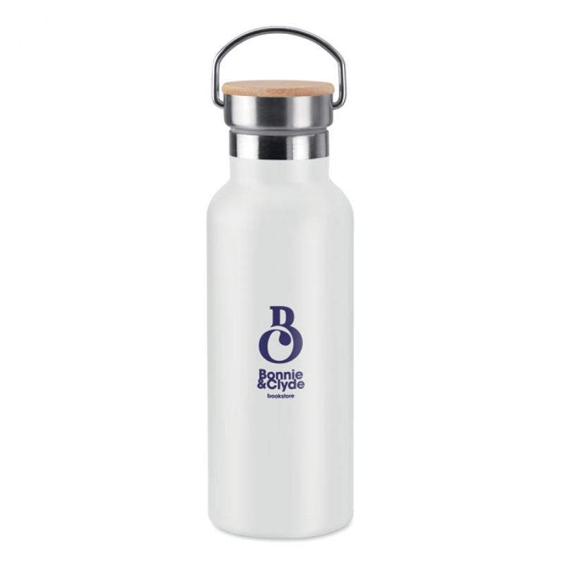 Dvoustěnná nerezová termoska s izolačním vakuem. 500 ml, Víčko z bambusu s poutkem. Sublimační tisk je možný pouze na bílý product. Neteče.