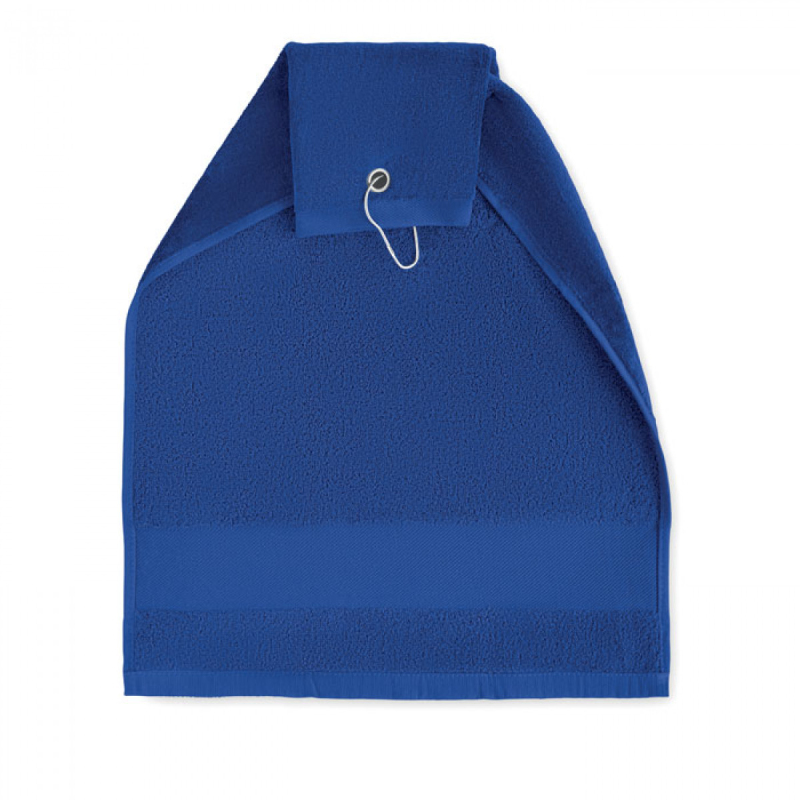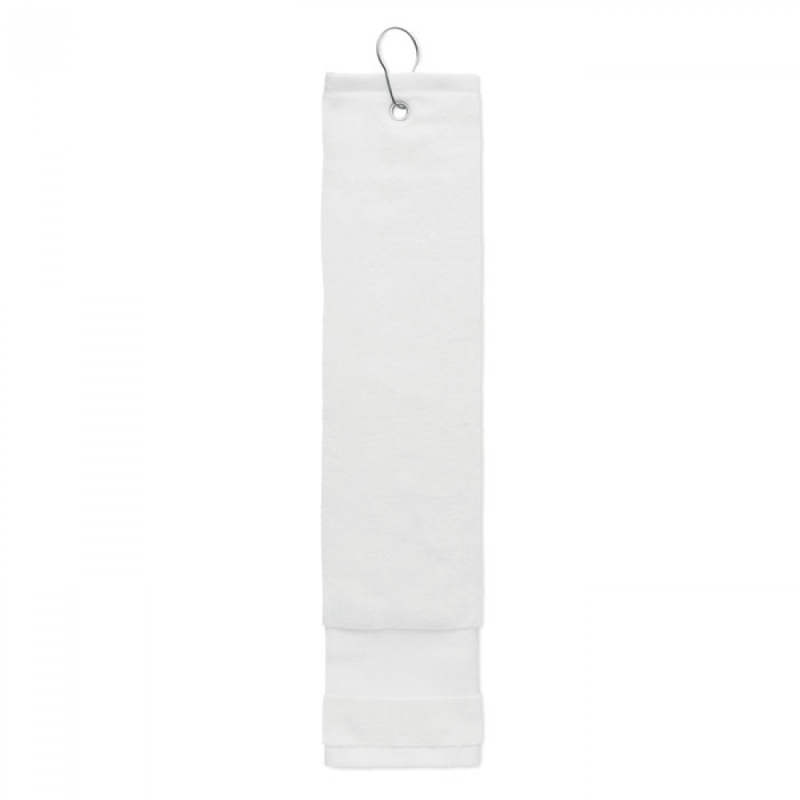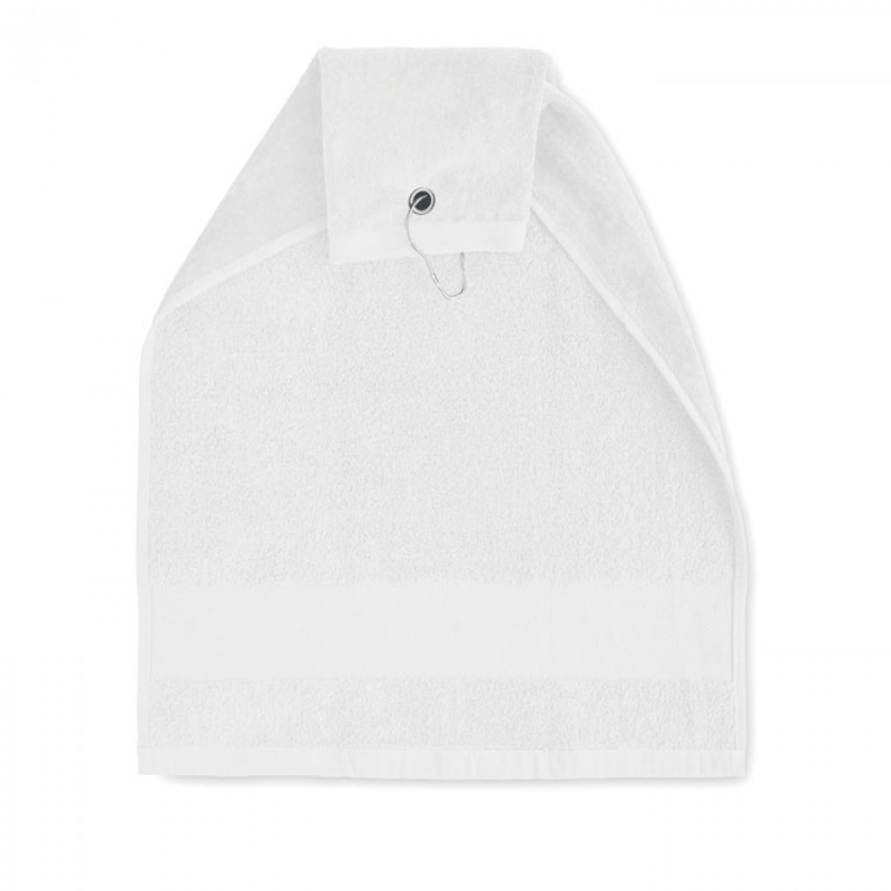 Bavlněný 350g golfový ručník s měděným otvorem a kroužkem sloužícím jako závěs. Velikost ručníku: 40x60 cm.