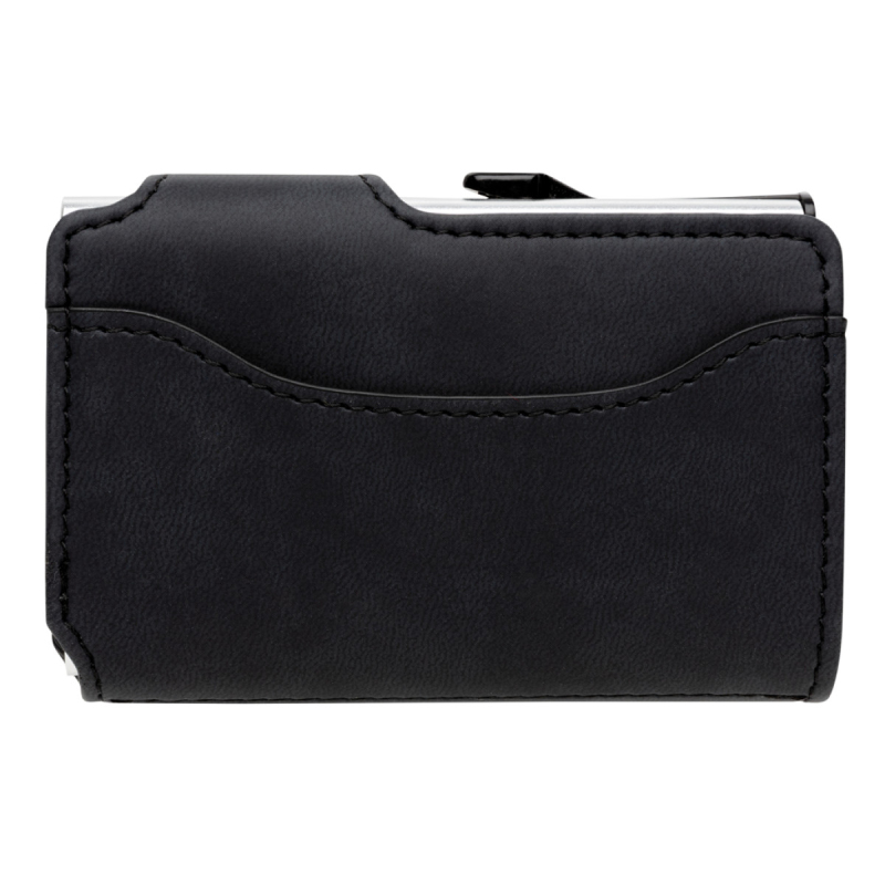 Pevné hliníkové pouzdro chránící karty před skimmingem či fyzickým poškozením s PU peněženkou. Pojme až 10 standardních nebo 6 embosovaných karet. Postranní jezdec pro postupné vysunutí všech karet.