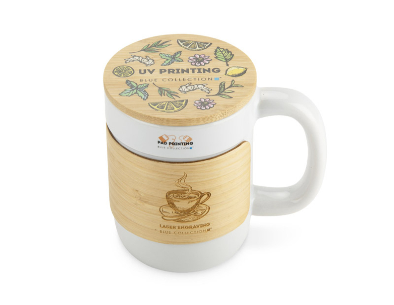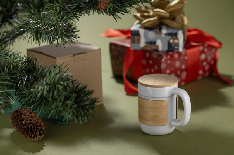 Hrnek MUGGI o objemu 350 ml kombinuje klasický tvar s moderními detaily. Je vyroben z vysoce kvalitní keramiky, dodává se s bambusovým víčkem a odpovídajícím termopáskem, který chrání vaše ruce před teplem nápoje. Víčko může pro větší pohodlí sloužit také jako podšálek. Přírodní bambusové akcenty dodávají hrnku jedinečný, příjemný vzhled a robustní rukojeť poskytuje pohodlné uchopení. Ideální do kanceláře nebo jako součást dárkové sady.