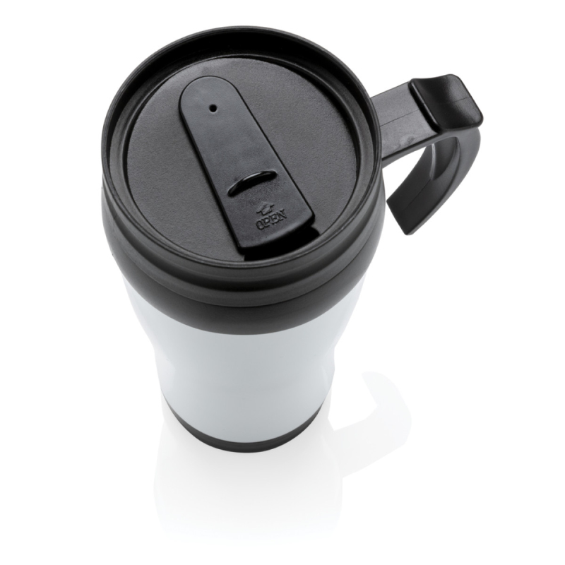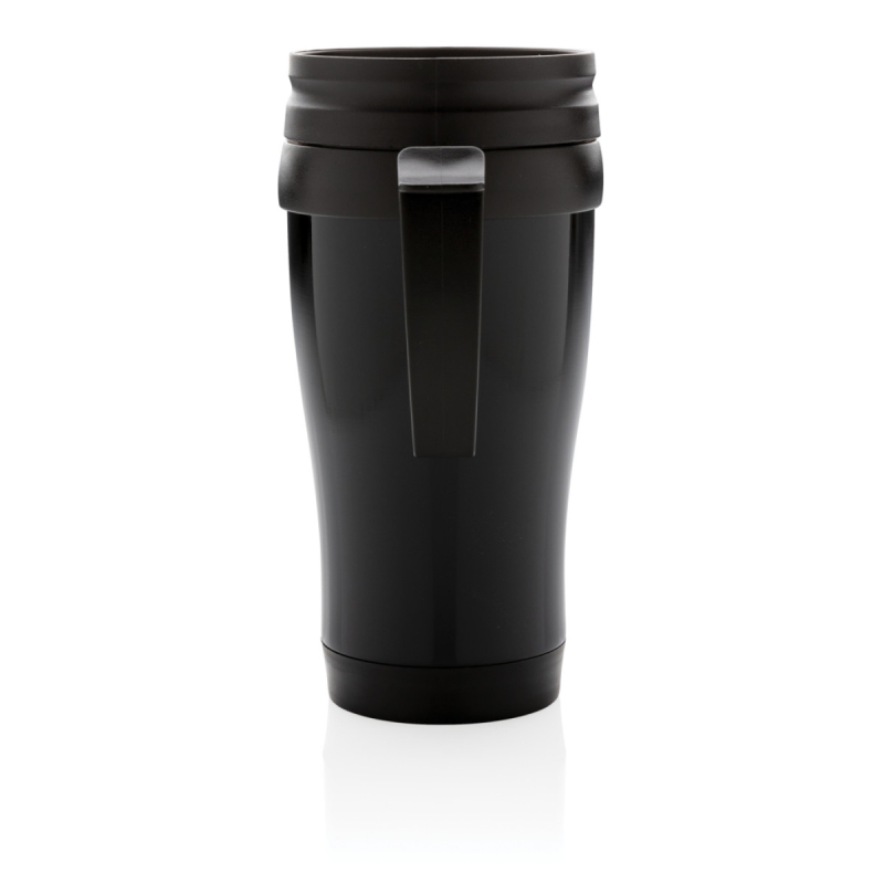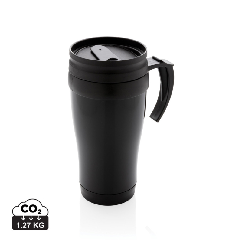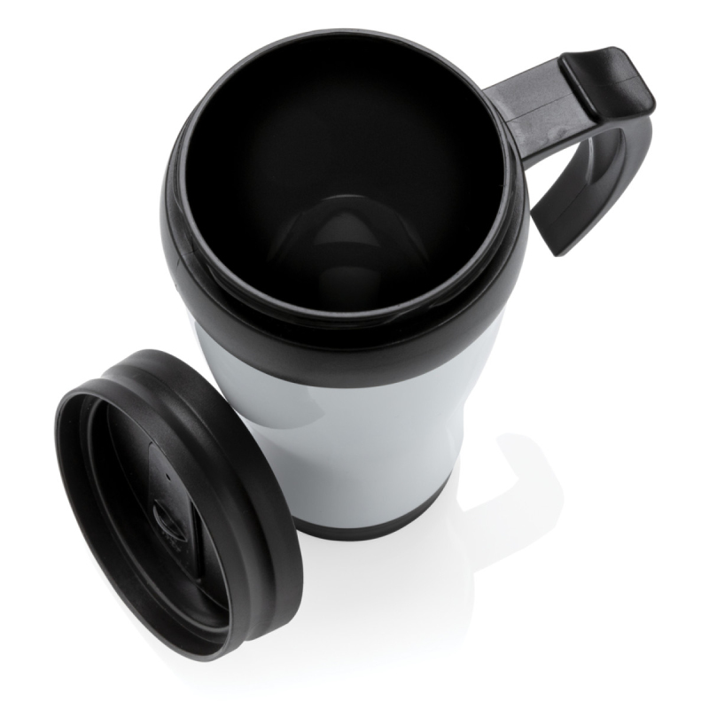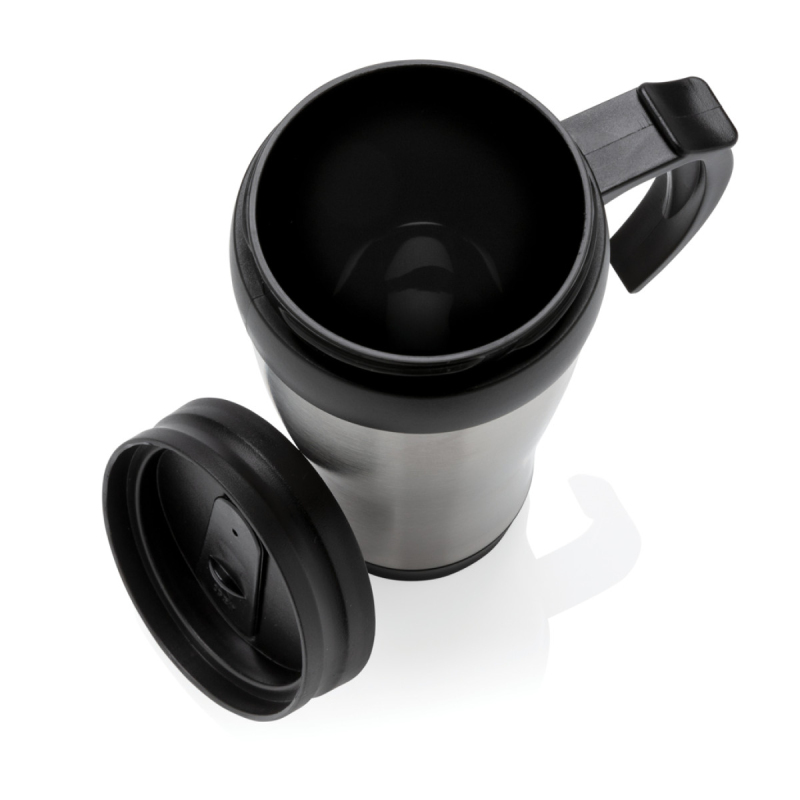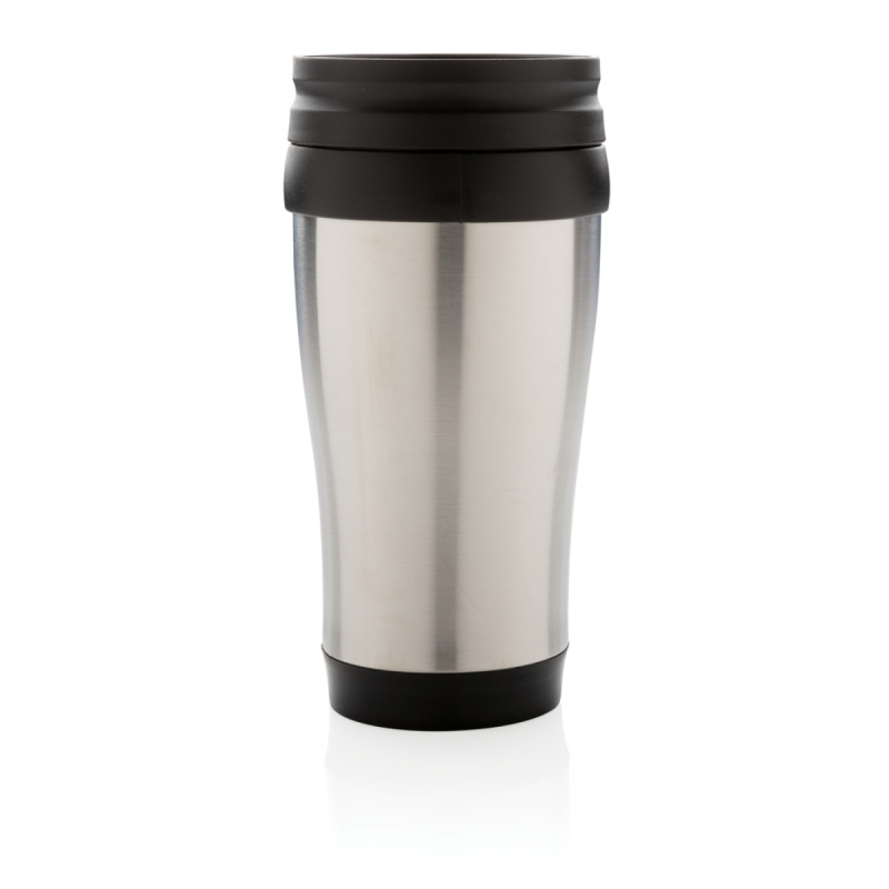 Hrnek o objemu 350 ml, vnější plášť z nerez oceli, vnitřek z PP, s černým víčkem a dnem.