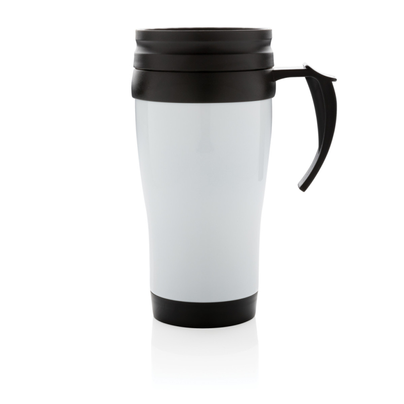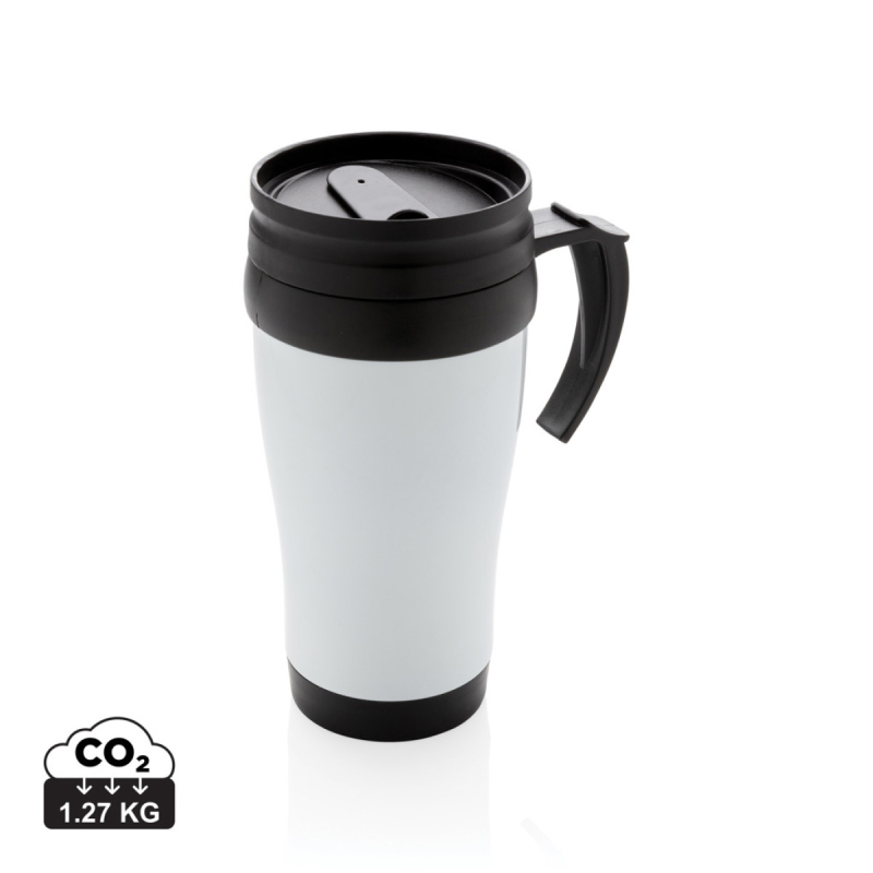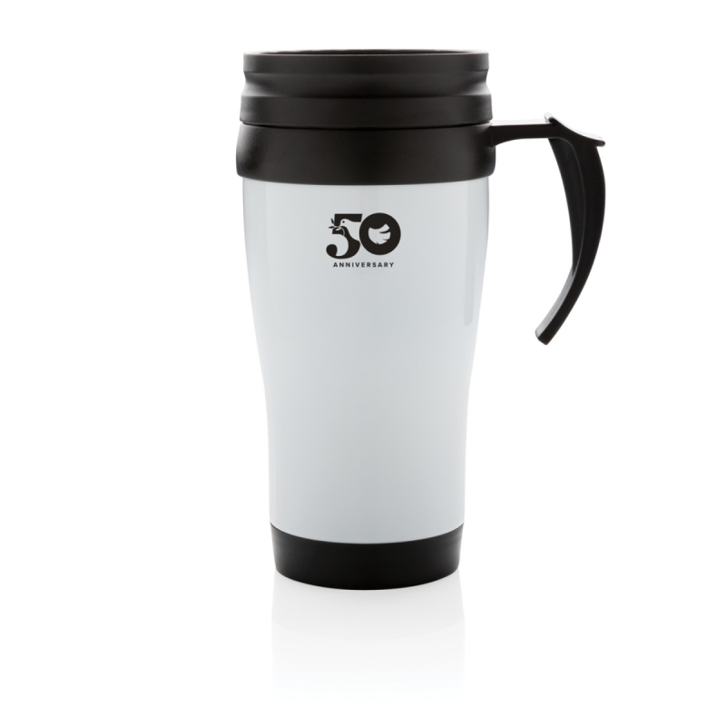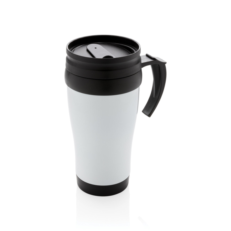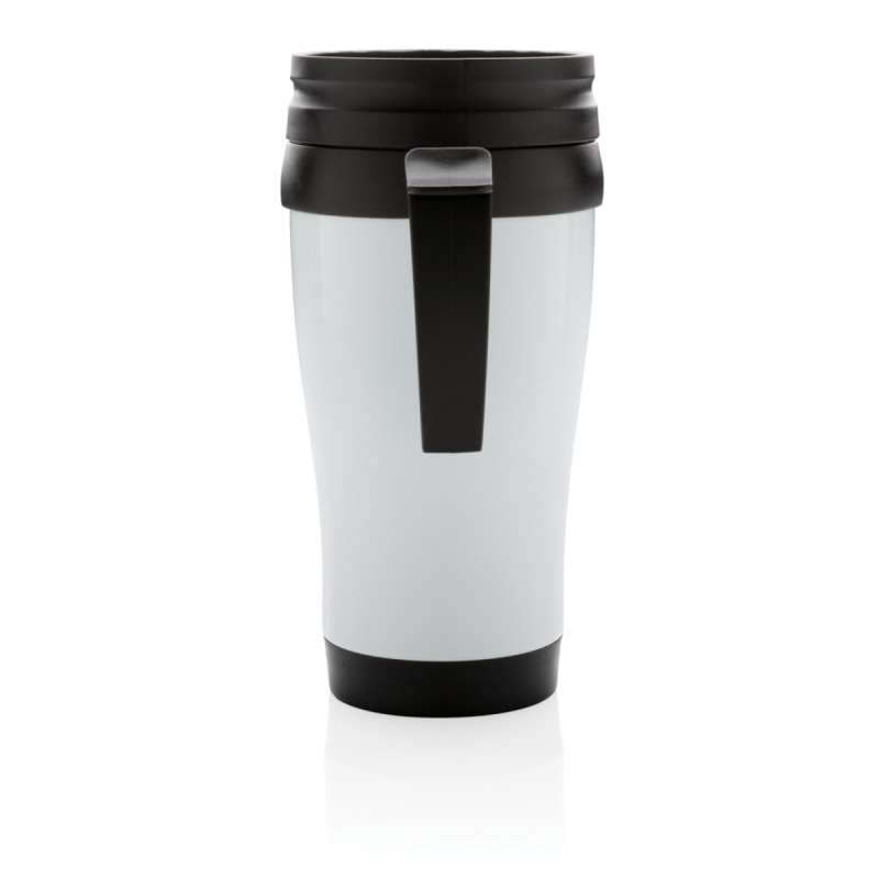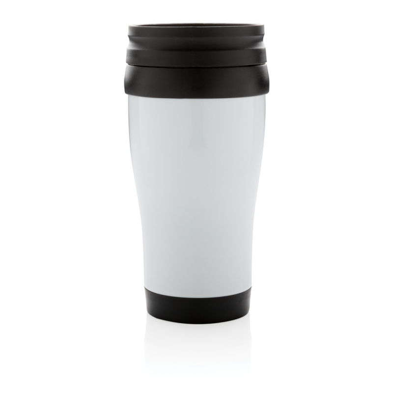 Hrnek o objemu 350 ml, vnější plášť z nerez oceli, vnitřek z PP, s černým víčkem a dnem.