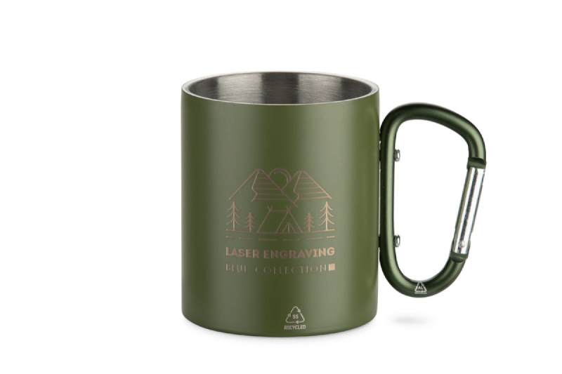 Hrnek VIVO o objemu 250 ml je vyroben z recyklované nerezové oceli a jeho rukojeť ve tvaru karabinky je vyrobena z recyklovaného hliníku. Matná povrchová úprava mu dodává moderní vzhled a karabina umožňuje hrnek snadno připnout k batohu nebo tašce. Je praktický na cesty, kempování nebo procházky, představuje atraktivní propagační pomůcku a vynikající volbu pro ty, kteří oceňují uvědomělá řešení.