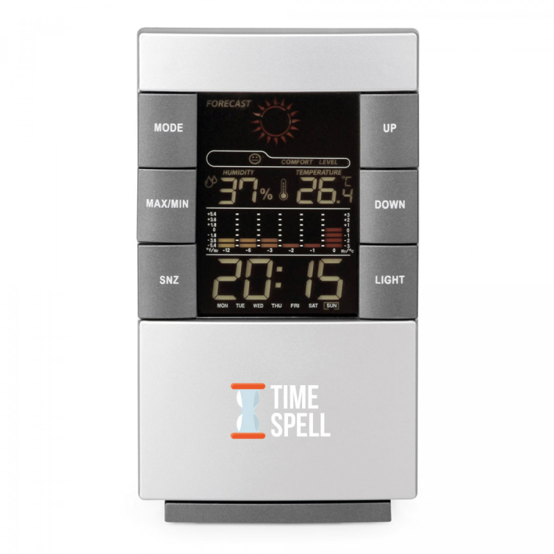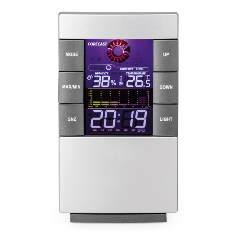 Stolní stanice s funkcemi: hodinový režim 12/24, budík, kalendář, teploměr, vlhkoměr a barevný displej. Obsahuje 2 AAA baterie. 80 x 140 x 39 mm