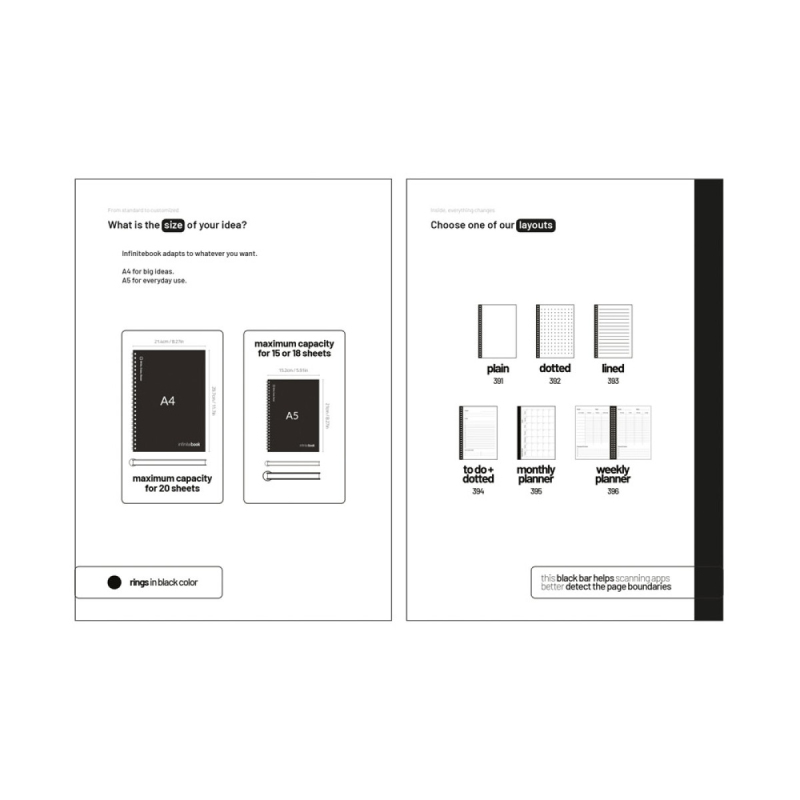 20stránková prezentace služby Infinitebook s příklady: možnosti obalů, možnosti tisku a možnosti stránek (čisté, tečkované, linkované, úkoly, měsíční plánování a týdenní plánování). 148 x 210 mm