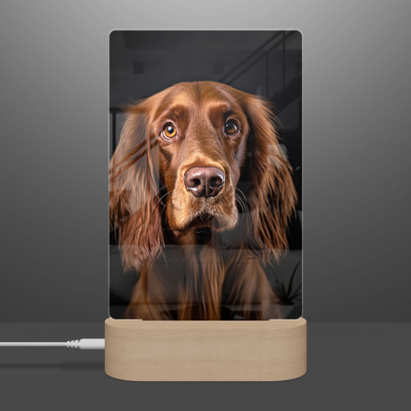 Součástí balení je akrylové sklo dle výběru, dřevěný RGB LED stojánek a napájecí USB kabel.