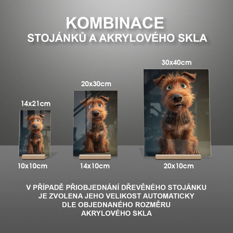 Na produktovém fotu vyobrazena nejoblíbenější varianta akrylového skla 14x21cm a dřevěný stojánek 10x10cm.
