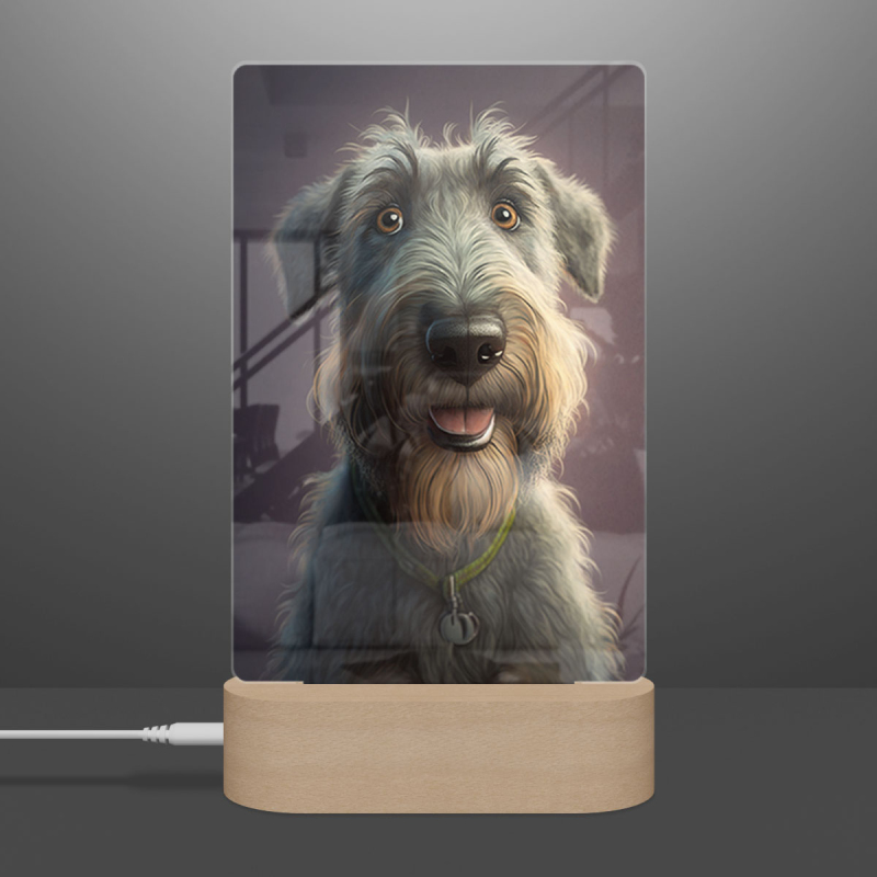 Součástí balení je akrylové sklo dle výběru, dřevěný RGB LED stojánek a napájecí USB kabel.