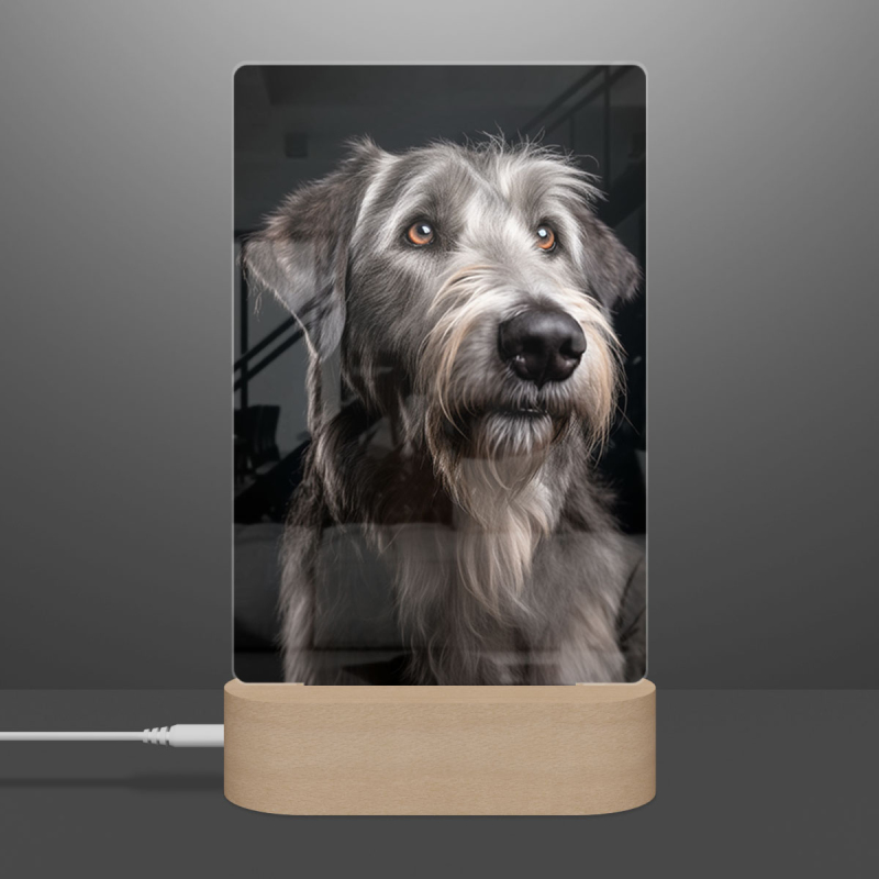Součástí balení je akrylové sklo dle výběru, dřevěný RGB LED stojánek a napájecí USB kabel.