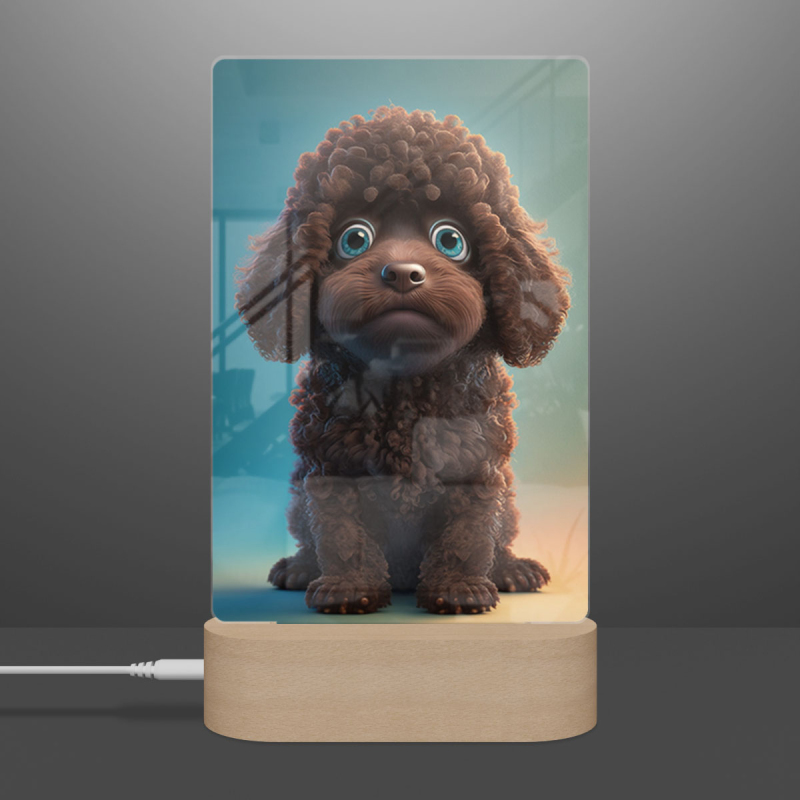 Součástí balení je akrylové sklo dle výběru, dřevěný RGB LED stojánek a napájecí USB kabel.