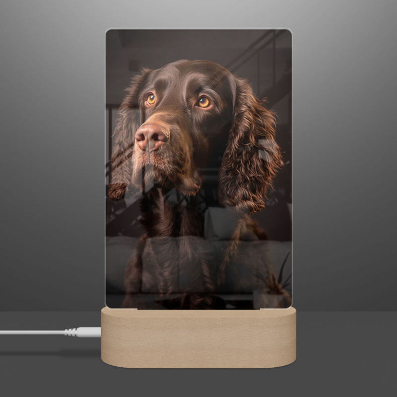 Součástí balení je akrylové sklo dle výběru, dřevěný RGB LED stojánek a napájecí USB kabel.