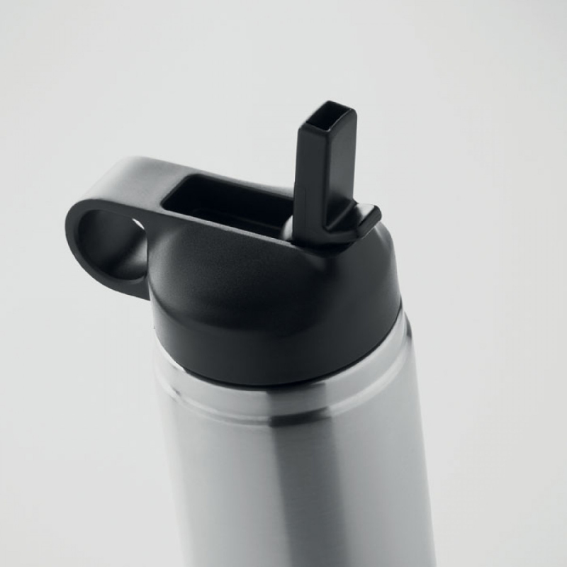 Dvoustěnná láhev z recyklované nerezové oceli (90 % recyklovaná nerezová ocel a 10 % nerezová ocel). Víčko z PP, s úchytem a integrovaným brčkem. Objem: 500 ml.