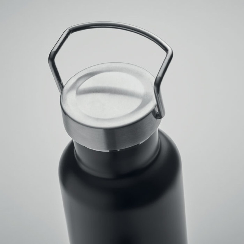 Dvojstěnná vakuově izolovaná láhev z recyklované nerezové oceli s víčkem s držátkem a korkovým detailem dna. Objem: 500 ml.