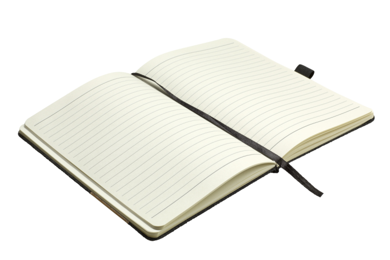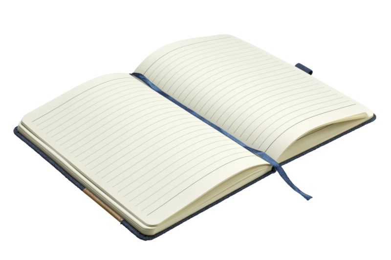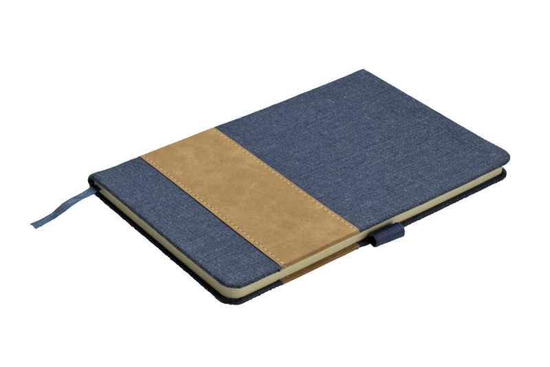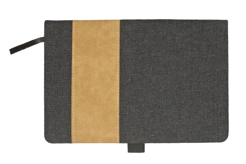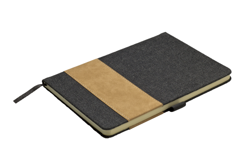 Poznámkový zápisník A5 v deskách v kombinaci černé denimové látky a přírodní PU kůže má 80 linkovaných listů z krémového papíru o hmotnosti 70 g. Blok má poutko na propisku a textilní záložku v černé barvě.