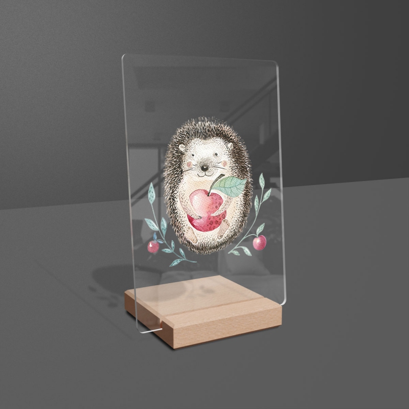 Na produktovém fotu vyobrazena nejoblíbenější varianta akrylového skla 14x21/21x14cm a dřevěný stojánek 10x10cm.