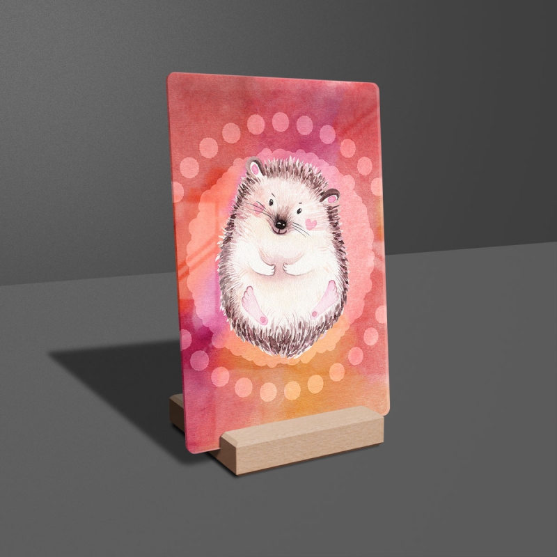 Na produktovém fotu vyobrazena nejoblíbenější varianta akrylového skla 14x21/21x14cm a dřevěný stojánek 10x10cm.