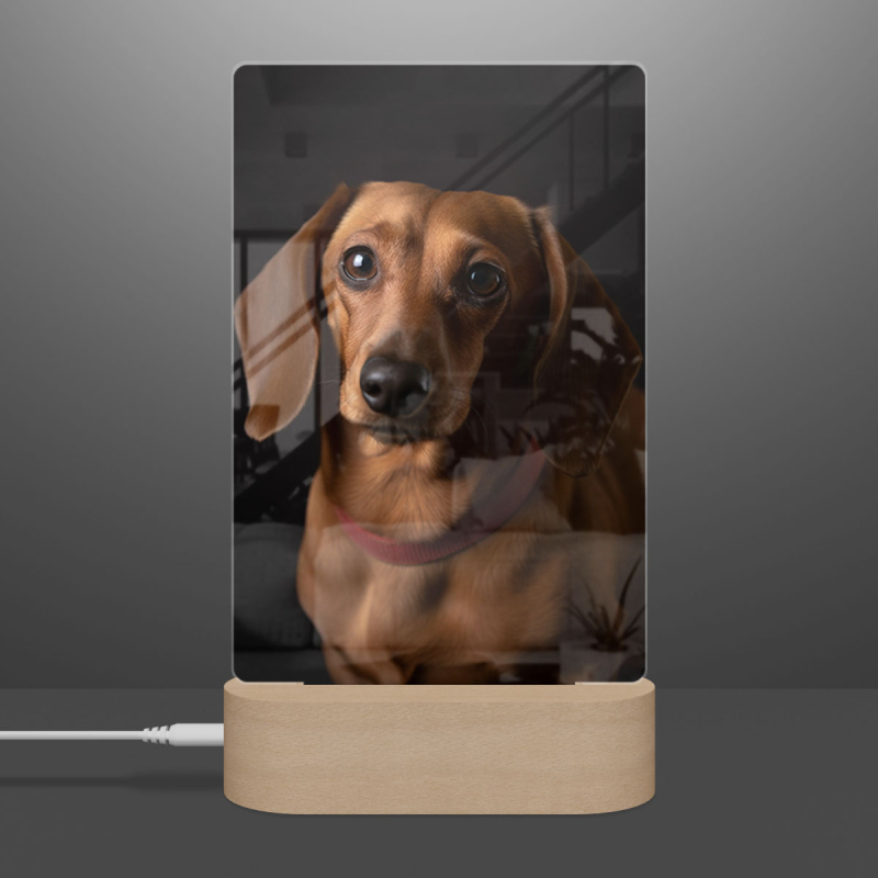 Součástí balení je akrylové sklo dle výběru, dřevěný RGB LED stojánek a napájecí USB kabel.