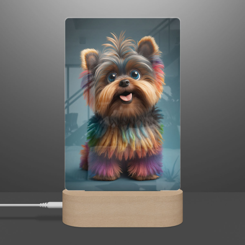 Součástí balení je akrylové sklo dle výběru, dřevěný RGB LED stojánek a napájecí USB kabel.