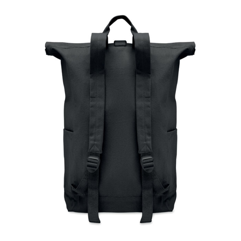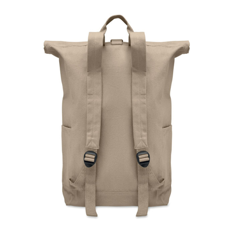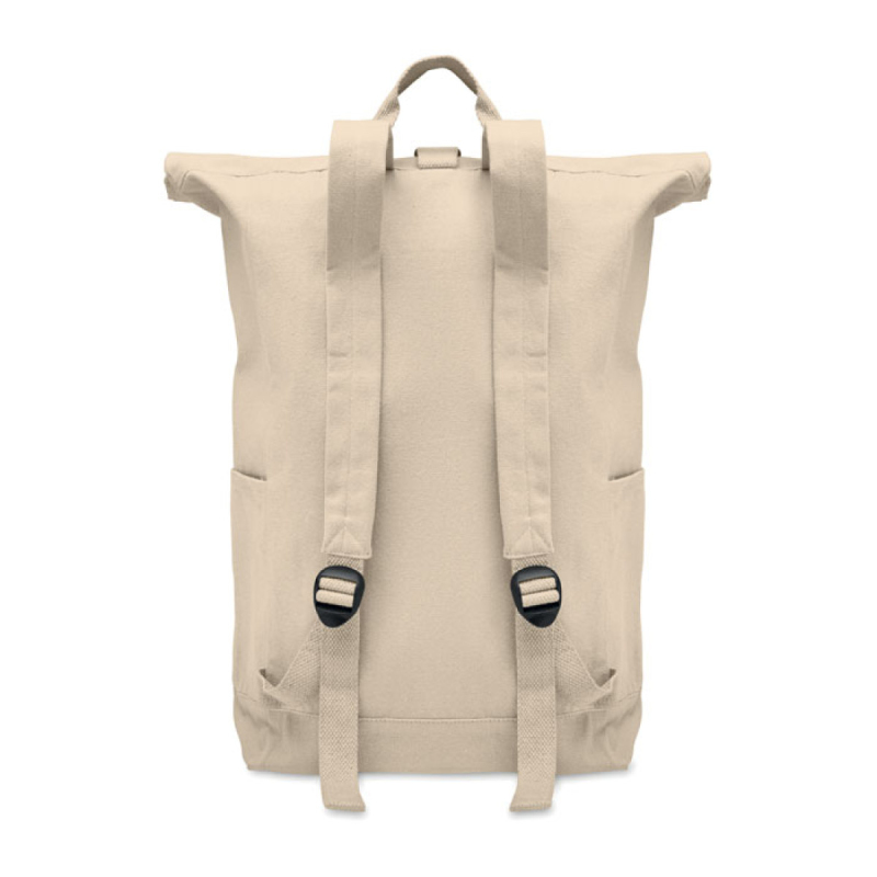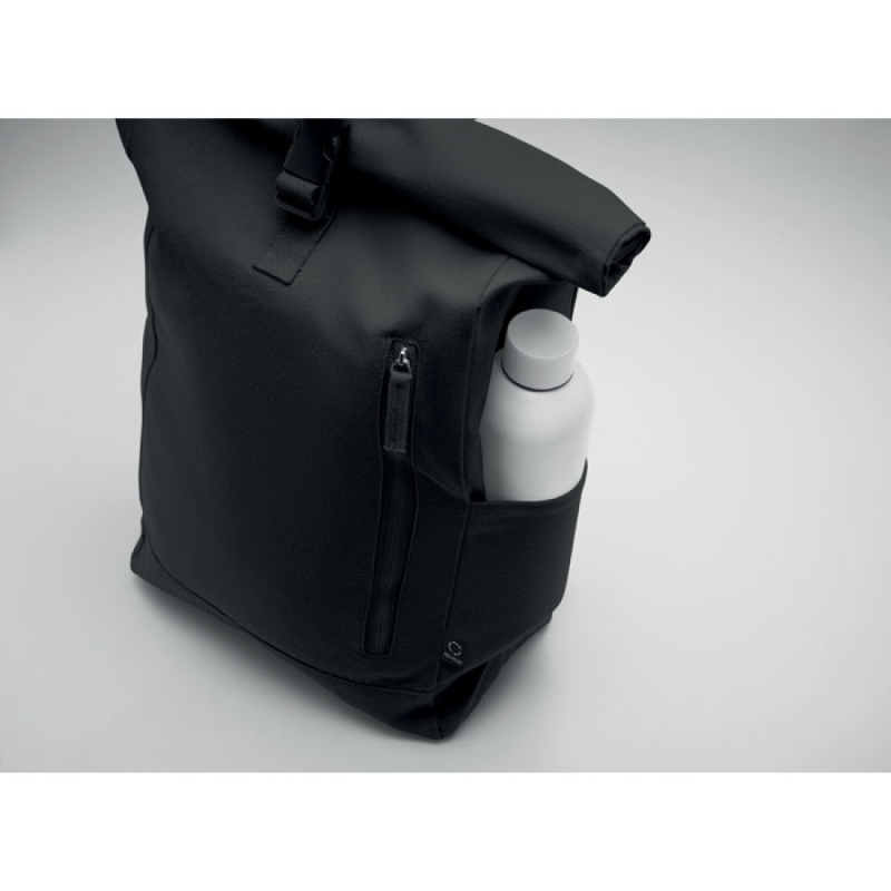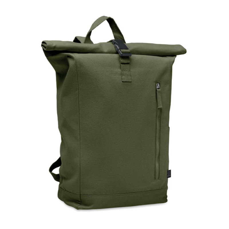 Rolovací batoh se zapínáním na suchý zip z 390g recyklované bavlny (80 %) a recyklovaného polyesteru (20 %). Přední kapsa na zip.