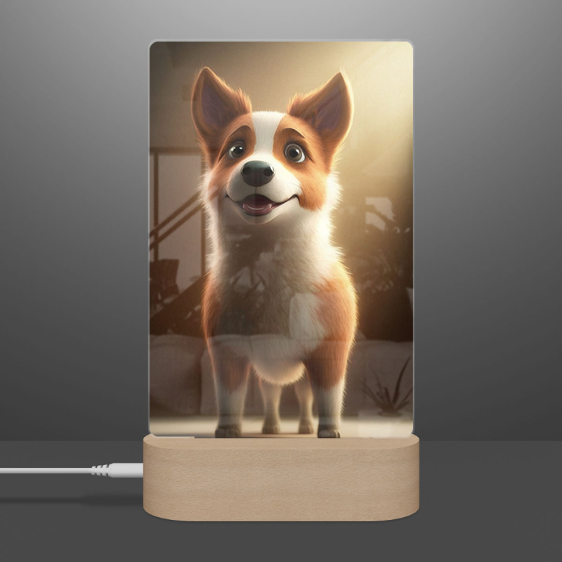 Součástí balení je akrylové sklo dle výběru, dřevěný RGB LED stojánek a napájecí USB kabel.