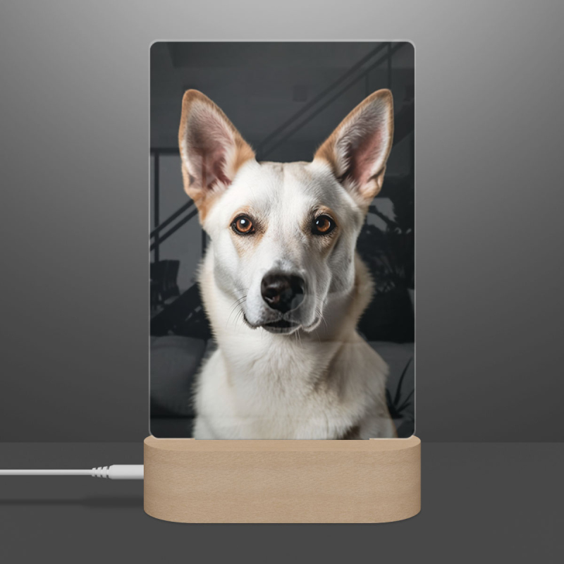 Součástí balení je akrylové sklo dle výběru, dřevěný RGB LED stojánek a napájecí USB kabel.