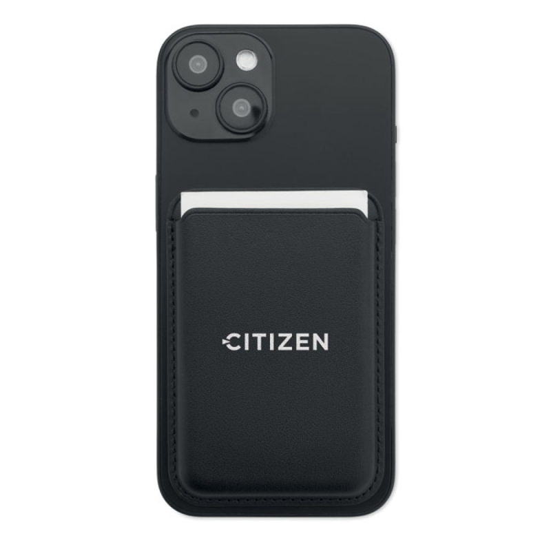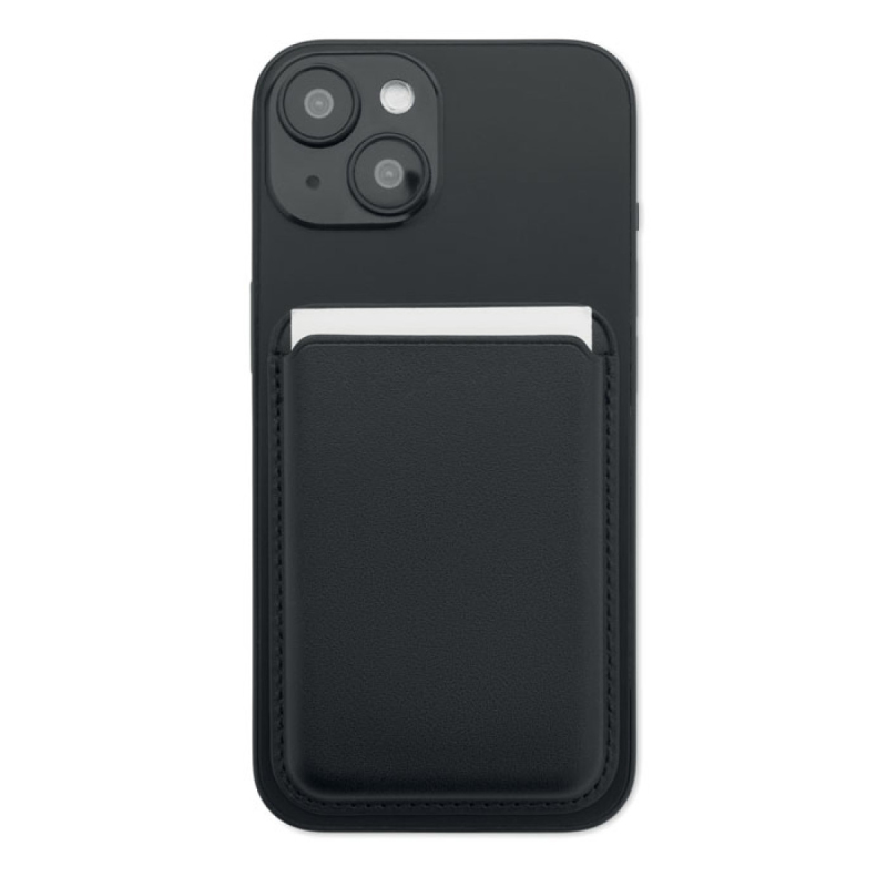 Magnetické pouzdro na kreditní karty z PU kůže (na 3 karty) s funkcí stojánku. Obsahuje přídavný kovový kroužek.