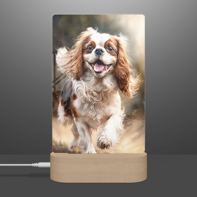 Součástí balení je akrylové sklo dle výběru, dřevěný RGB LED stojánek a napájecí USB kabel.