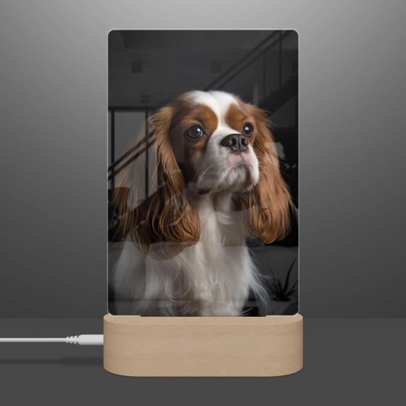 Součástí balení je akrylové sklo dle výběru, dřevěný RGB LED stojánek a napájecí USB kabel.