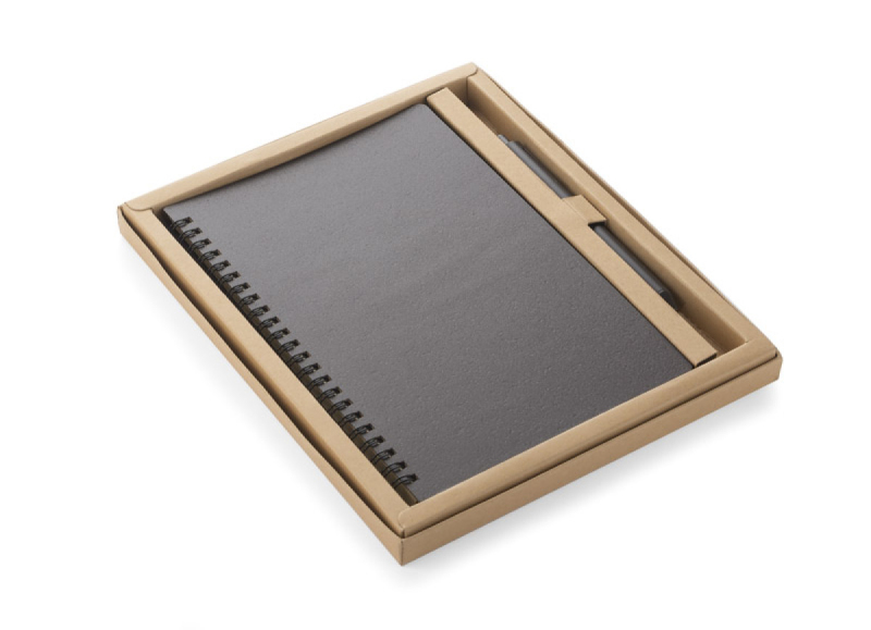 Notebook KOPI je dokonalým nápadem na ekologický dárek. Obal bloku a pero jsou vyrobené z plastu smíchaného ve 40% s kávovými zrny, což umožňuje použití mnohem menšího množství plastu. Má 70 řádkových listů z hnědého recyklovaného papíru. Sada obsahuje kuličkové pero s modrou náplní. Celé je to zabaleno v pěkné hnědé kartonové krabici, která dokonale odpovídá ekologickému trendu.