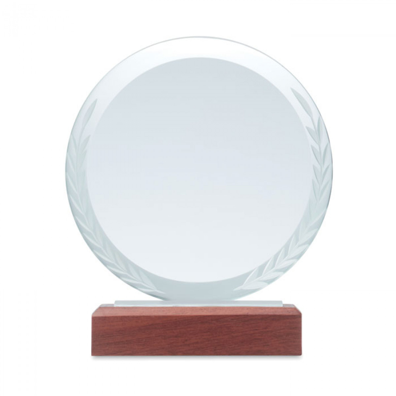 Kulatá skleněná trofej nebo pamětní plaketa na bukovém dřevěném podstavci v dárkové krabičce.
