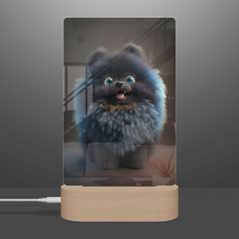 Součástí balení je akrylové sklo dle výběru, dřevěný RGB LED stojánek a napájecí USB kabel.