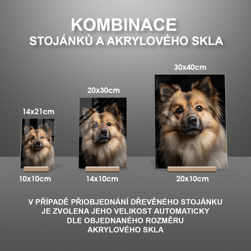 V případě přiobjednání dřevěného stojánku je zvolena jeho velikost automaticky dle objednaného rozměru akrylového skla viz produktové foto.