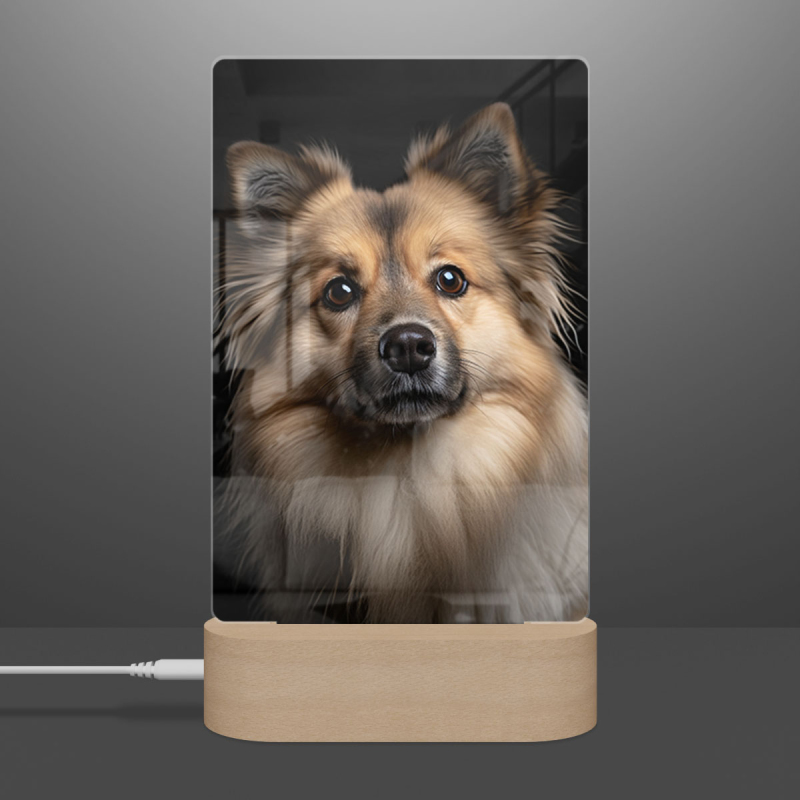 Součástí balení je akrylové sklo dle výběru, dřevěný RGB LED stojánek a napájecí USB kabel.