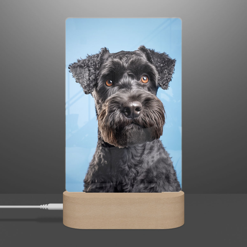 Součástí balení je akrylové sklo dle výběru, dřevěný RGB LED stojánek a napájecí USB kabel.