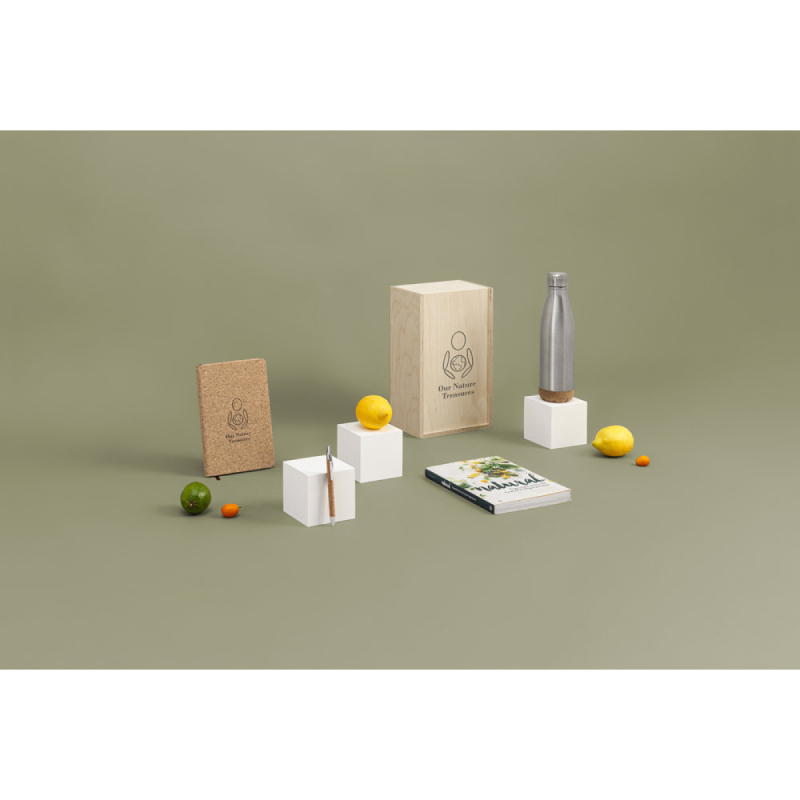 Korková sada je sada produktů, která zdůrazňuje jednoduchost přírodního materiálu, jakým je korek. Skládá se z korkového sešitu formátu A5 se 160 stranami v hladké barvě slonové kosti, korkového kuličkového pera a lahvičky s korkovou základnou a dvojitou vakuovou izolací. Dodáváno v krabičce z přírodní překližky s posuvným víkem ze stejného materiálu. Kits products supplied separately when not customized. Vnitřek: 290 x 164 x 104 mm | Vnější 309 x 189 x 118 mm