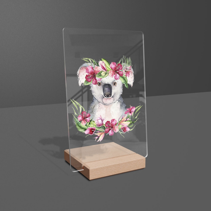 Na produktovém fotu vyobrazena nejoblíbenější varianta akrylového skla 14x21/21x14cm a dřevěný stojánek 10x10cm.