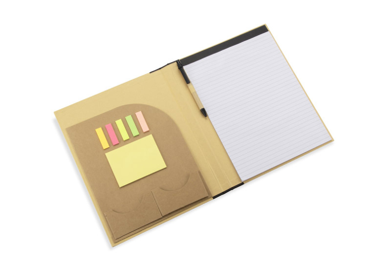 Konferenční kufřík DOSI A4 je všestranný a praktický přístroj, ideální pro obchodní jednání a konference. Obsahuje linkovaný blok, kapsu na dokumenty a dvě menší kapsy na vizitky a poznámky. Složka je polstrovaná a dodává se s papírovým perem, žlutými samolepicími poznámkami a sadou malých kartiček, které jsou ideální pro označení důležitých míst v poznámkách. DOSI se uzavírá gumičkou, aby se dokumenty neztratily. Vyrobeno z papíru, který je ekologickou alternativou ke složkám ze syntetických materiálů.