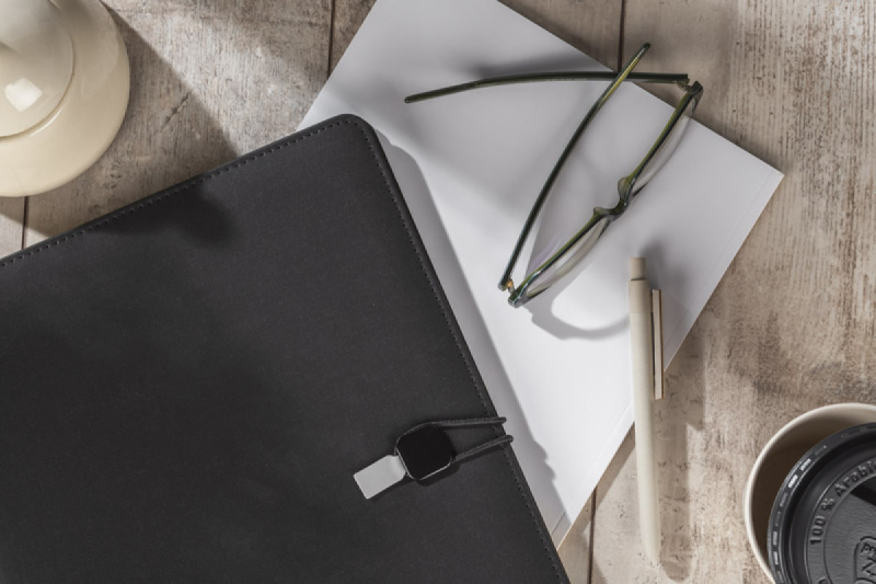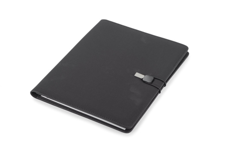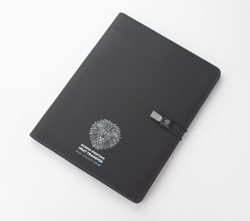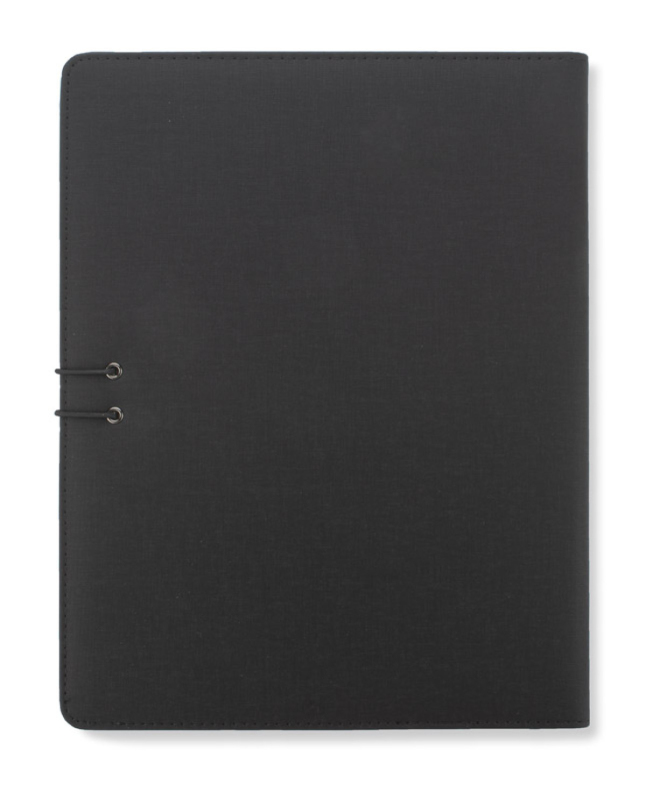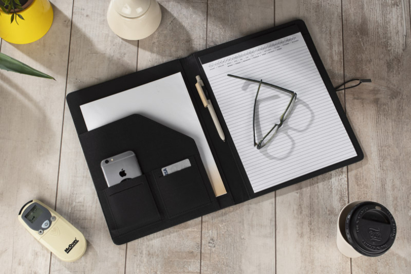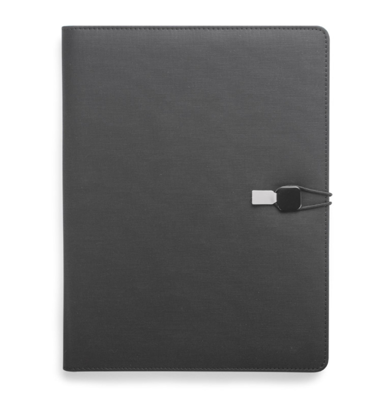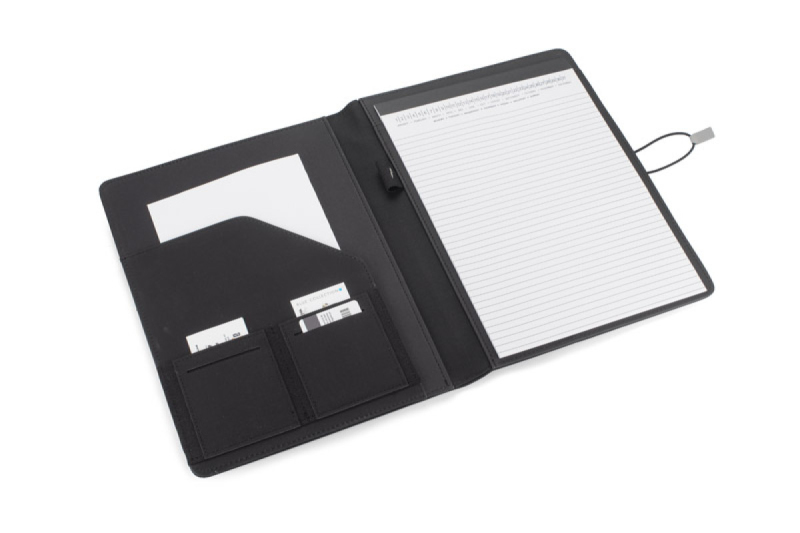Mapa na dokumenty TELLA uzavřená gumovým zakončením šedou ekokožou, což usnadňuje otevírání kufříku a zároveň je zajímavou a elegantní dekorací. Obsahuje jednu kapsu pro uložení dokumentů, dvě menší kapsy, místo pro pero a vizitky a notebook A4 s možností jeho výměny.