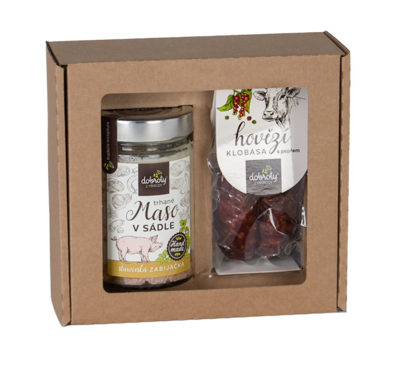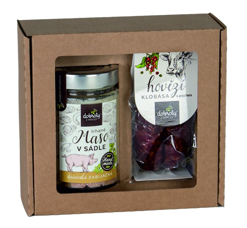 Trhané maso v sádle 250 g, Hovězí klobása s pepřem 2 ks/ cca 90g