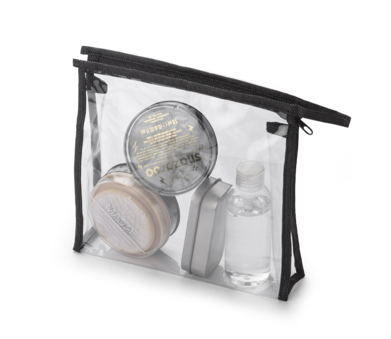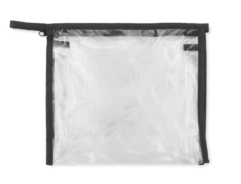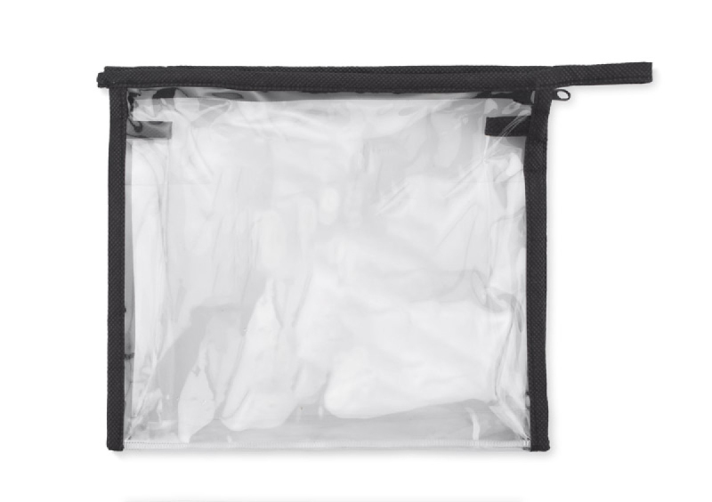 Průhledný prací vak se zipem. Vyrobeno z PVC a netkaného polypropylenu. Perfektní jako kabelka pro ukládání tekutin do příručních zavazadel.