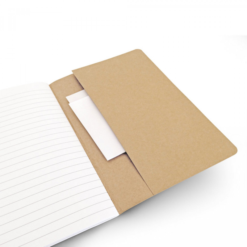 Poznámkový blok A5 s 80 linkovanými stranami z recyklovaného papíru a kartonovými deskami s vnitřní kapsou. 144 x 210 mm