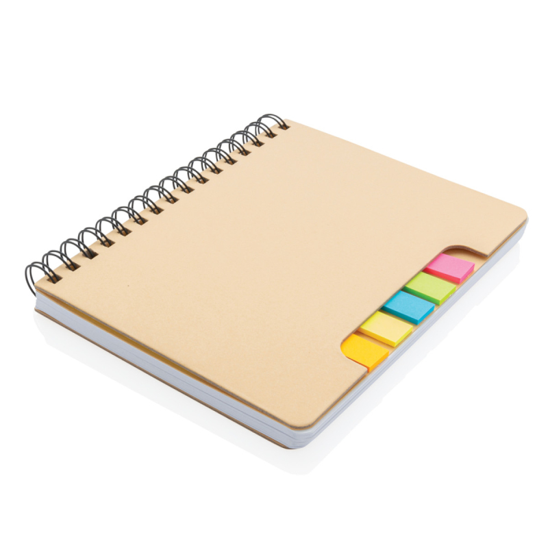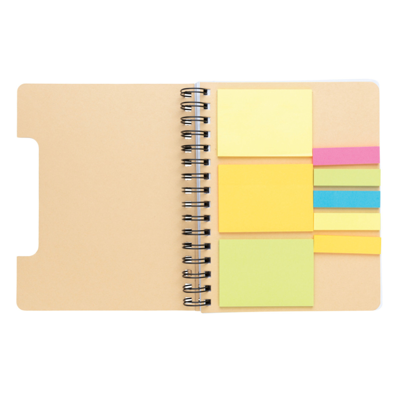 Praktický poznámkový blok s kroužkovou vazbou a lepítky v postranní části kraftového obalu. Obsahuje 100 listů/200 stran recyklovaného linkovaného papíru s gramáží 80g/m2 a 30 lepítek o 2 velikostech z každé barvy.