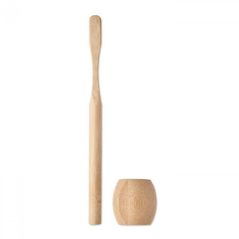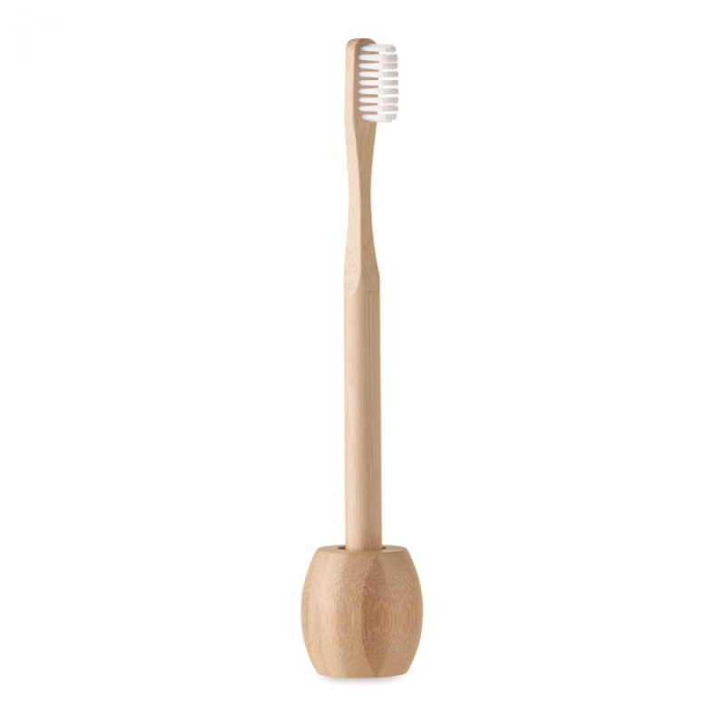 Zubní kartáček s bambusovou rukojetí, se stojánkem. Dodáváno v kraftové papírové krabičce.