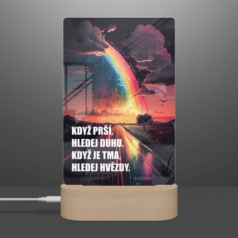 Součástí balení je akrylové sklo dle výběru, dřevěný RGB LED stojánek a napájecí USB kabel.