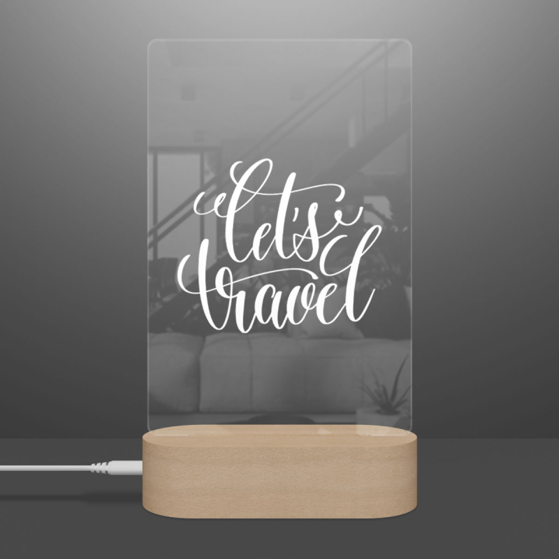 Součástí balení je akrylové sklo dle výběru, dřevěný RGB LED stojánek a napájecí USB kabel.
