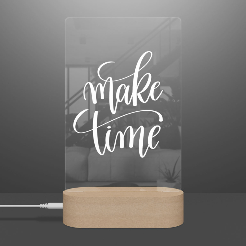 Součástí balení je akrylové sklo dle výběru, dřevěný RGB LED stojánek a napájecí USB kabel.