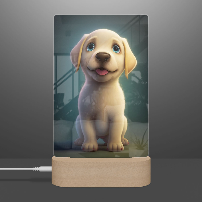 Součástí balení je akrylové sklo dle výběru, dřevěný RGB LED stojánek a napájecí USB kabel.