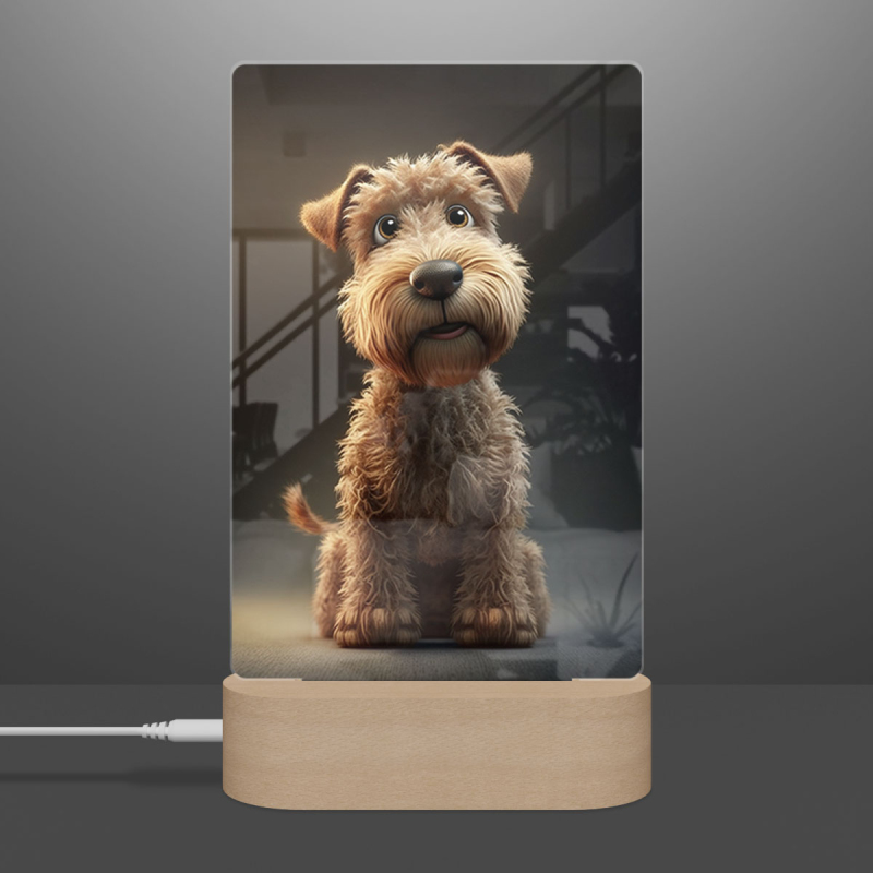 Součástí balení je akrylové sklo dle výběru, dřevěný RGB LED stojánek a napájecí USB kabel.