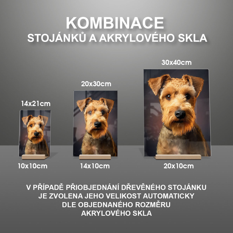 Na produktovém fotu vyobrazena nejoblíbenější varianta akrylového skla 14x21cm a dřevěný stojánek 10x10cm.